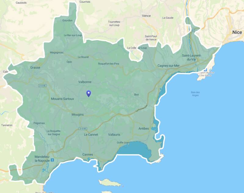 J'interviens sur la zone environnante à Valbonne schématisée ci dessous couvrant les communes de Mouans Sartoux, Mougins, Biot, Opio, Vallauris, Antibes, Golfe-Juan, Cannes, Le Cannet, Mandelieu La Napoule, La Roquette-sur-Siagne, Pégomas, Grasse, Magagnosc, Le Rouret, Roquefort-les-Pins, Le Bar-sur-Loup, Cagnes-sur-mer, Saint Laurent-du-Var: